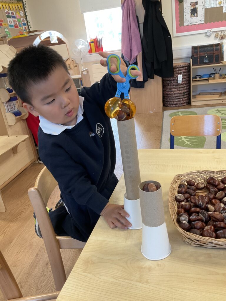 Seasonal change and the story The Squirrels Who Squabbled provided the inspiration for the activities in nursery last week. The children explored using various tools to transfer conkers into cardboard towers and predicting which tower would hold the most conkers, before transferring the conkers, counting as they did so.